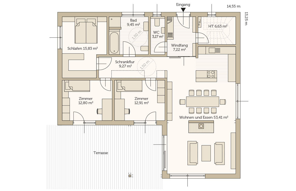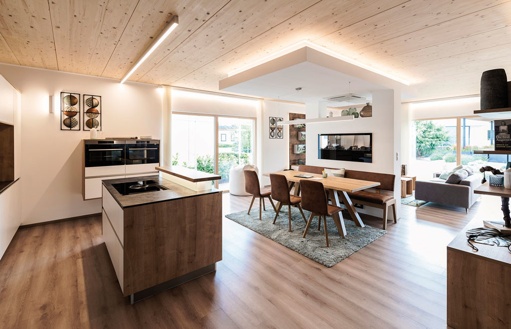Der Bungalow Elegance 130 von WOLF Haus ist ein barrierefreier und komfortabler Klassiker, der nie aus der Mode kommt: Unterschiedliche Raumhöhen und eine sichtbare Holzdecke im Wohn-/Essbereich tragen zu einem besonderen Wohngefühl bei. Das Schlafzimmer verfügt über einen großzügigen Schrankraum, die zwei Kinderzimmer sind gleichwertig konzipiert. Ein offenes „Showfeuer“ in der Wohntrennwand ist eine weitere Besonderheit dieses Hauses. Dieses Haus ist nicht nur mit Flachdach, sondern auch mit Walmdach erhältlich.