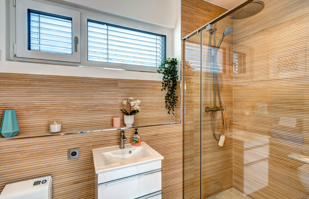 Bereits von außen fällt die großzügige Eingangs- und Terrassenüberdachung auf, die auch bei Regen ein trockenes Heimkommen bzw. Entspannen im Freien ermöglicht. Besonders beeindruckend ist die zweigeschoßige Glasfront, die zusätzlichen Raum schafft, mehr Licht ins Innere lässt und einen traumhaften Ausblick ermöglicht. Ein weitere innovative Lösung wird mit der extrabreiten Glas-Faltwand mit einer Größe von 5,60 x 2,46m geboten – ideal für einen fließenden Übergang von Drinnen nach Draußen. Ein absolutes Highlight stellt die in die Küche integrierte kompakte Technikbox dar, wodurch kein eigener Technikraum nötig ist und man zusätzlichen Wohnraum gewinnt. Die funktionale Wohntreppe bietet praktischen Stauraum sowie Platz zum Spielen und kann auch als Fensterbank genutzt werden.
