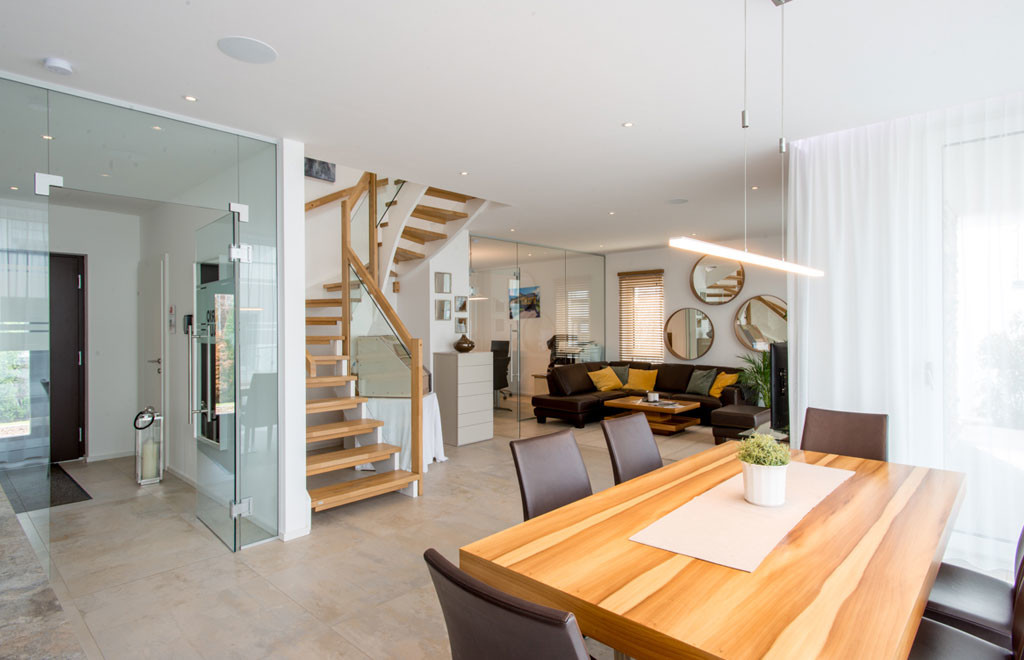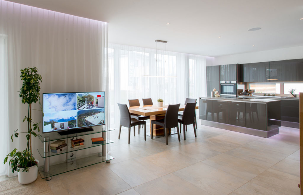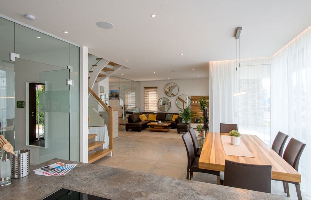Im neuen Musterhaus New Design Esprit zeigt VARIO-HAUS auch, wie die Haustechnik praktisch gesteuert werden kann. Es ist als Smart Home, gemeinsam mit Kooperationspartner Loxone, konzipiert. Das bedeutet, dass – so man das möchte – Heizung, Beleuchtung, Beschattung und Musik im ganzen Haus automatisch oder mit Hilfe von Smartphone, Tablet oder Schalter steuerbar sind. Sogar die Sonne kann optimal genutzt werden: Wenn notwendig, heizt sie einen Raum auf, andererseits kann ihre Einstrahlung mittels automatischer Beschattung reduziert werden, um Überhitzung zu vermeiden. Selbstverständlich kann jederzeit manuell eingegriffen werden. Das neue Haus wird außerdem mit einer hochmodernen flüster-leisen Luftwärmepumpe vom Systempartner Vaillant beheizt und gekühlt.