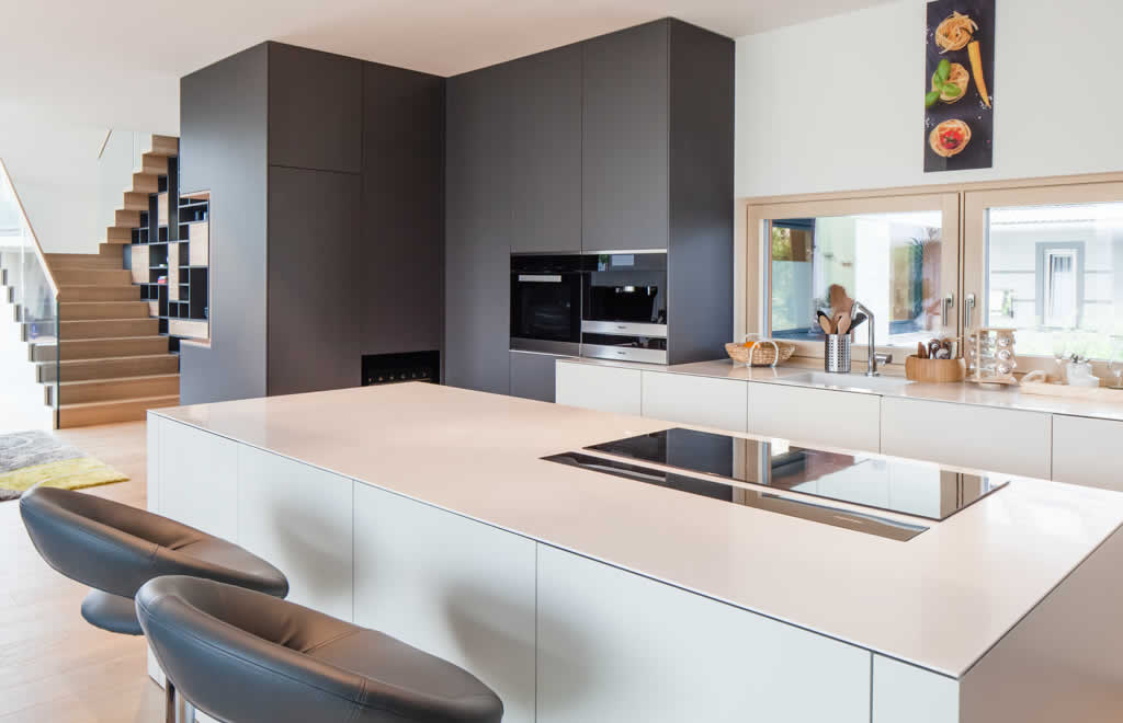 Architektonisch mehr als interessant: Das Pure W BlackLine von Lumar ist ein Haus mit großer Persönlichkeit. Das Innere hält, was das Äußere verspricht: Ein offenes und äußerst geräumiges Erdgeschoss mit großen Glasflächen sorgt nicht nur für maximale Lichtdurchflutung, sondern auch für die ästhetische Verbindung zum begrünten Außenbereich. Rund 35 m2 sind Küche und Essbereich gewidmet, und weitere 50 m2 dem Wohnbereich. Eine dekorative Treppe führt in die Galerie der oberen Etage mit Ausblick auf die untere Ebene. Im Obergeschoss befinden sich ein größeres Eltern-Schlafzimmer mit eigener Garderobe und Badezimmer, zwei weitere (Schlaf)-Räume und ein kleineres Badezimmer.